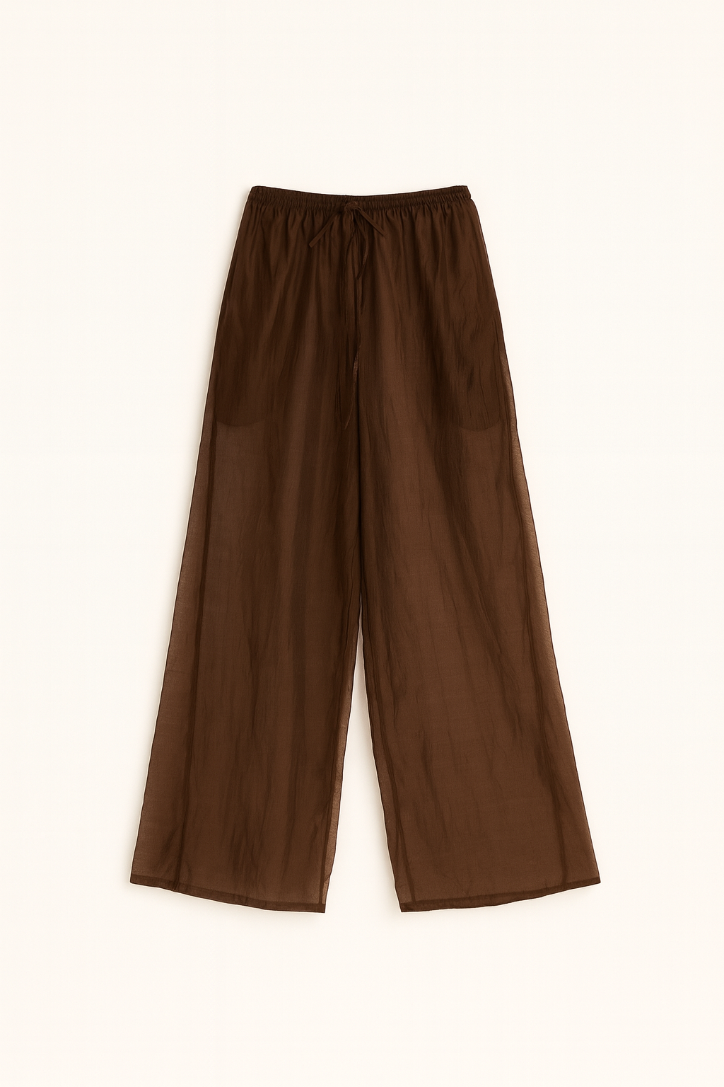 Lightweight two-piece set crafted from sheer cotton voile. The relaxed shirt and wide-leg pants create an effortless, airy silhouette — perfect for warm days and coastal evenings. Worn over a bikini or on bare skin, it blends sensuality with minimalism, evoking the essence of slow island living.